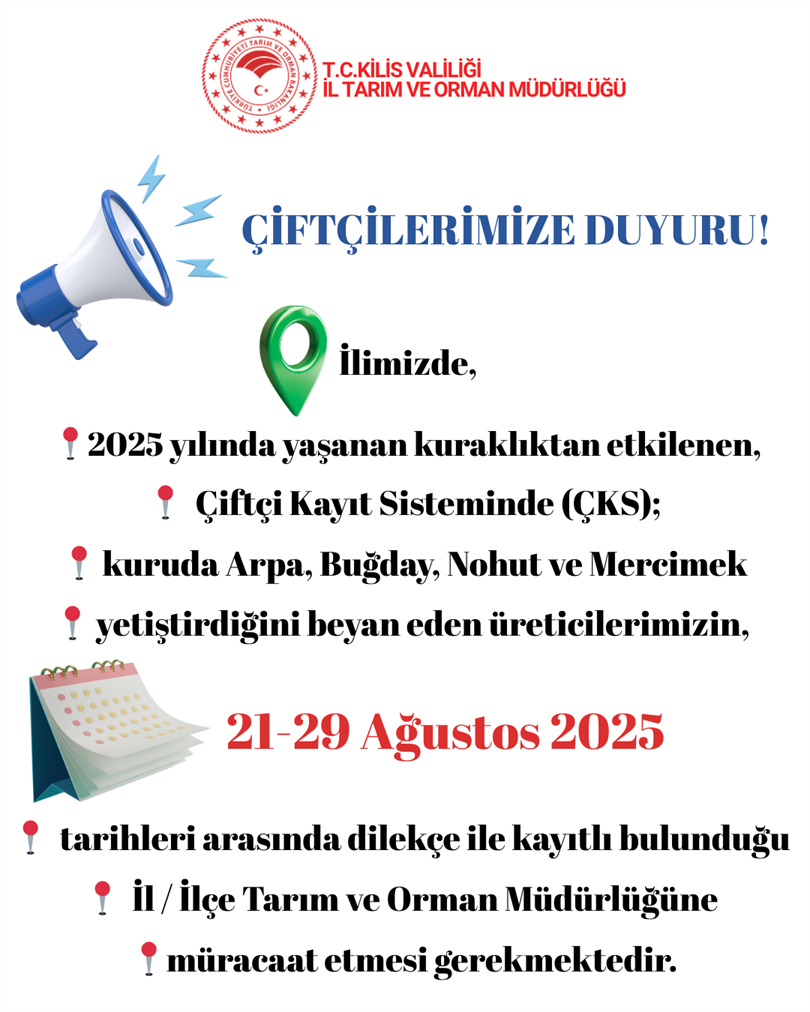 İlimizde yaşanan kuraklıktan dolayı, 2025 yılında ÇKS kaydı ile kuru alanlarda Arpa, Buğday, Nohut ve Mercimek yetiştirdiğini beyan eden üreticilerimizin, 21-29 Ağustos 2025 tarihleri arasında Kuraklıktan etkilendiğini belirten dilekçelerini İl Tarım ve Orman Müdürlüğümüze vermeleri gerekmektedir.