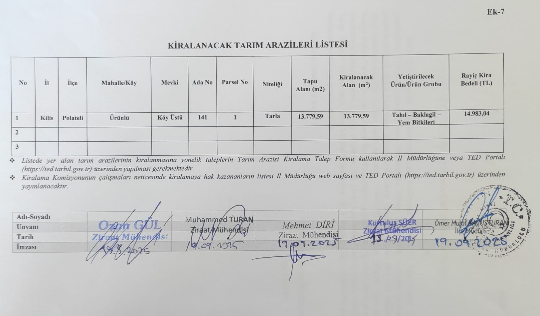İlimiz Polateli İlçe sınırları içerisinde bulunan işlenmeyen tarım arazilerine ait bilgiler 22.09.2025-29.09.2025 tarihleri arasında 7 (yedi) gün süre ile askıya çıkarılmıştır. Arazi Malikleri ve diğer ilgililer ilan süresi içerisinde itirazlarını yazılı olarak Polateli İlçe Tarım ve Orman Müdürlüğüne yapabilirler. Listede yer alan tarım arazilerinin kiralanmasına yönelik taleplerin ilan süresi içerisinde “Tarım Arazisi Kiralama Talep Formu" kullanılarak İlçe Müdürlüğüne veya TED Portalı (https://ted.tarbil.gov.tr) üzerinden yapılması gerekmektedir.